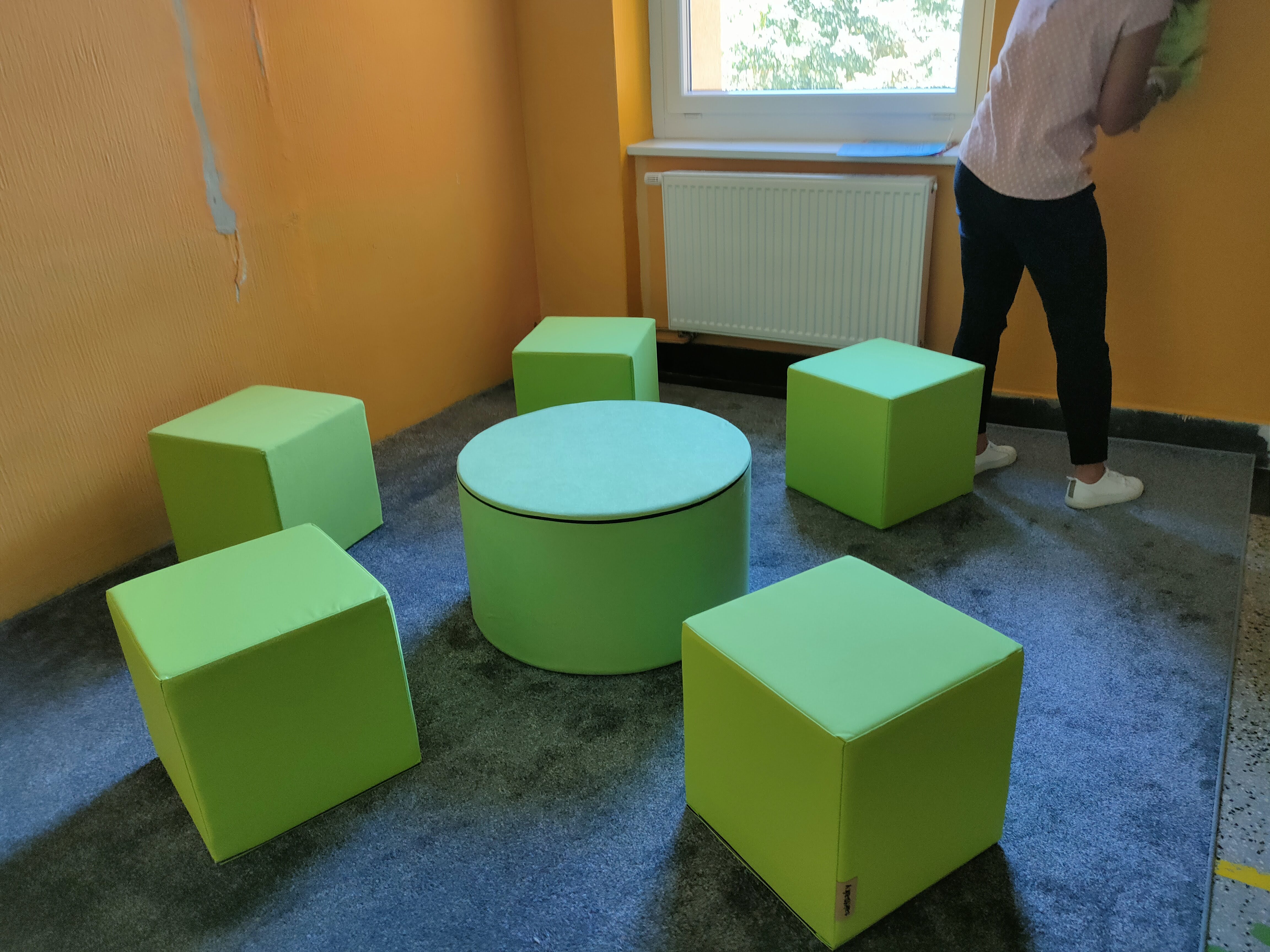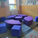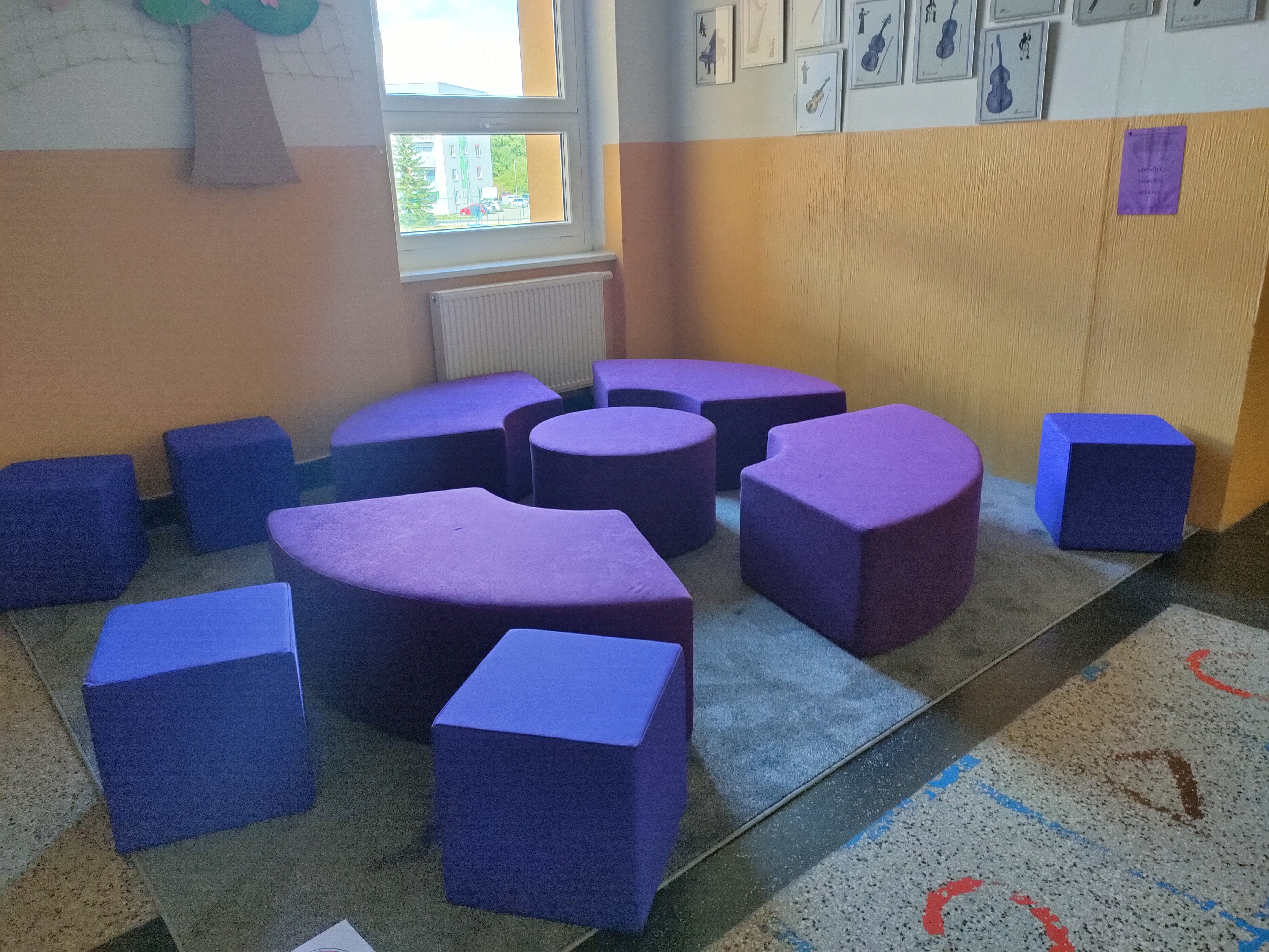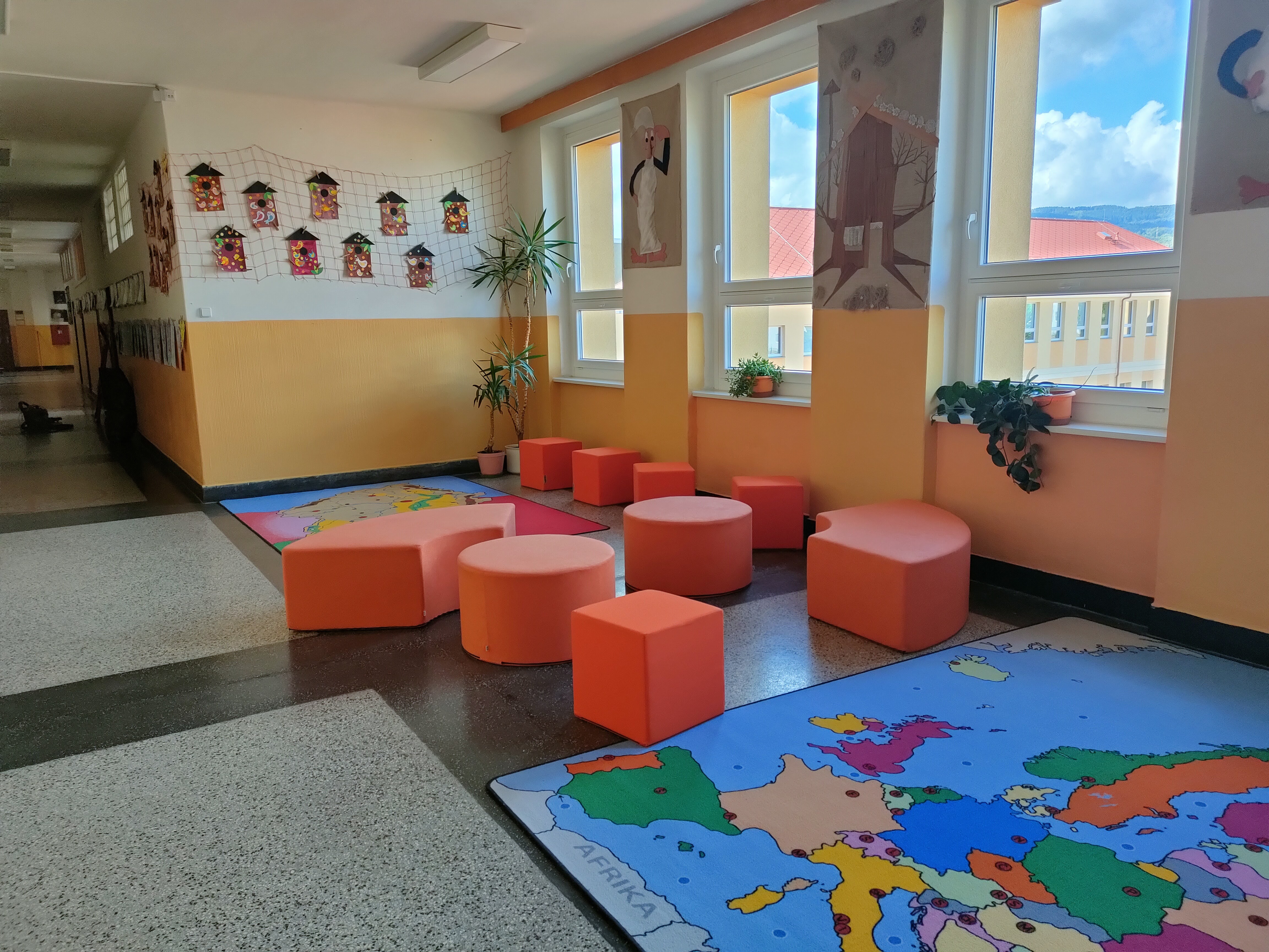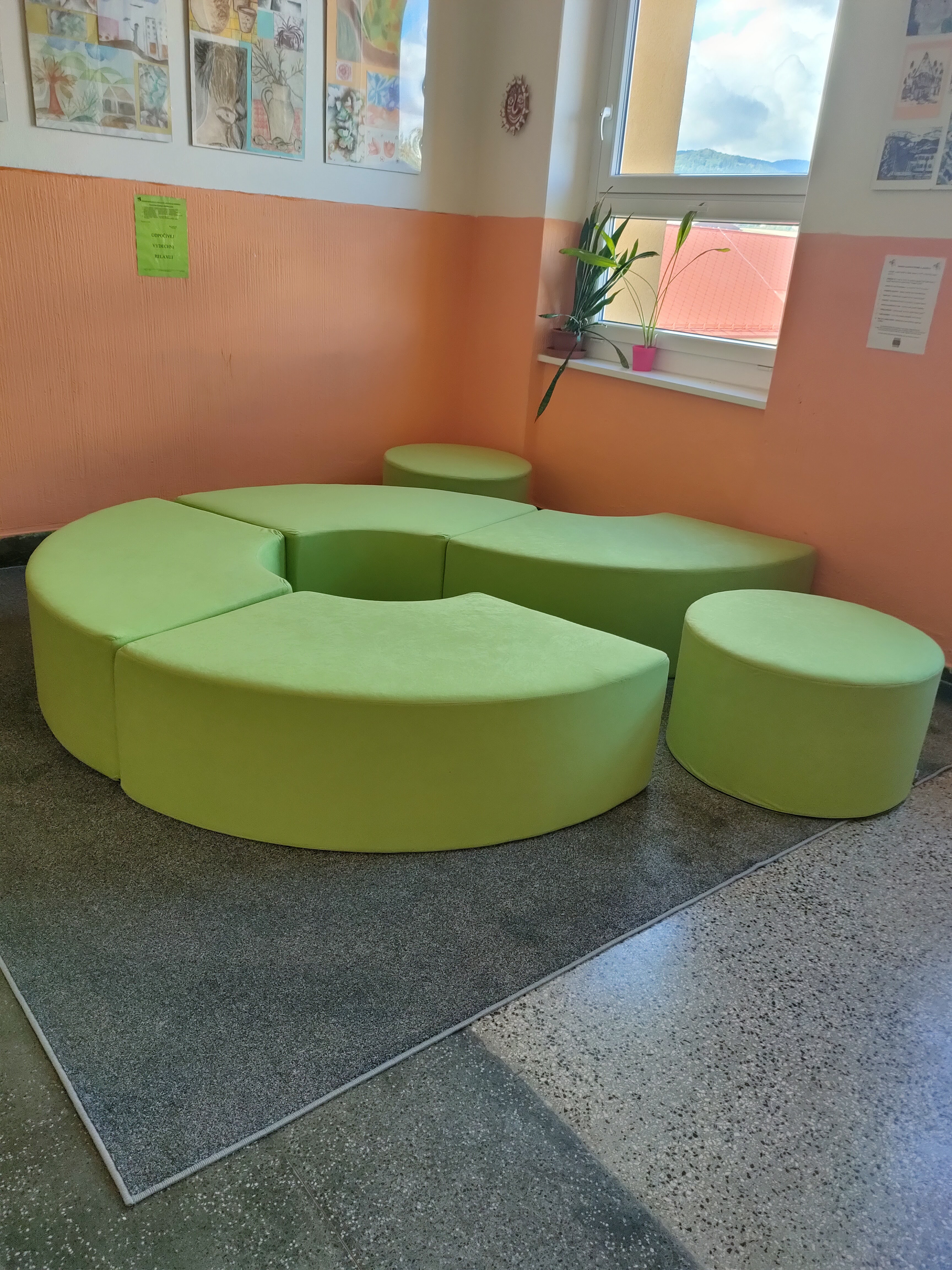 Dnes 1. září jsme zahájili nový školní rok. Ale ani o prázdninách škola nespala. Naopak tu byl čilý ruch. Vznikalo nové zasíťování. Objevily se nové lavičky před vchodem družiny, kde rodiče čekají na své ratolesti. Budovala se nově učebna ICT. Zmizely letité sedačky na chodbách. A tím největším překvapením pro žáky bylo vybudování osmi odpočinkových relaxačních zón. Zatím je to krásná barevná podívaná, ale relaxační koutky se budou během roku vyvíjet a doplňovat. A ptát se budeme i našich žáků.