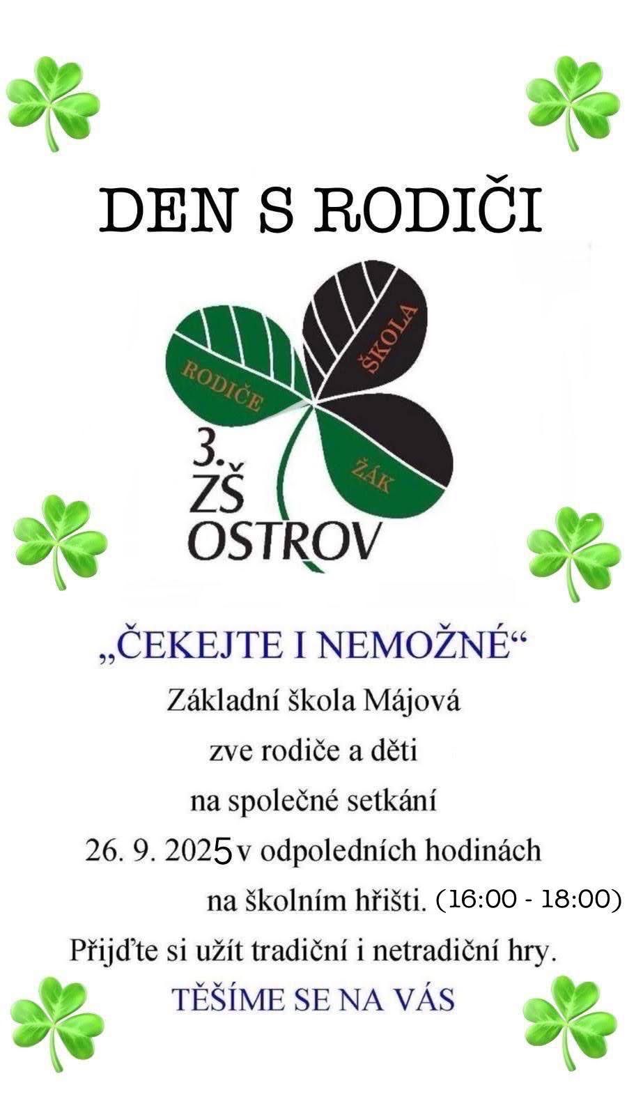 Tak jako každý rok v měsíci září i letos připravujeme Den s rodiči. V pátek 26. září se na vás těšíme. Přijďte se svými dětmi na naše hřiště. Zde je pozvánka: