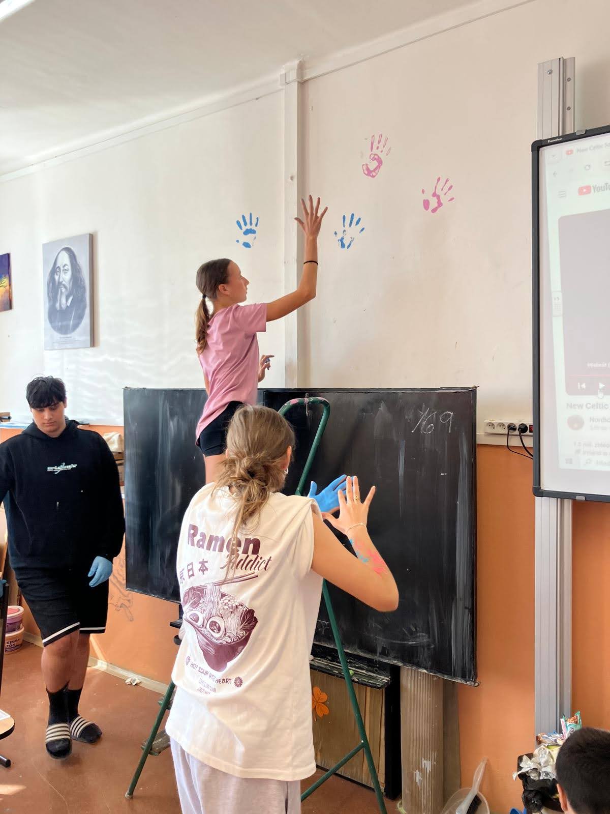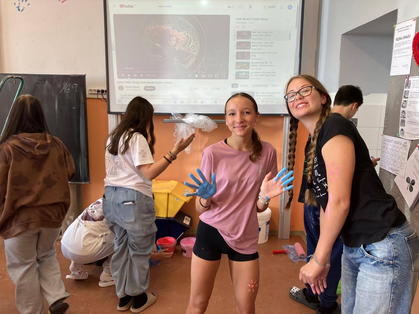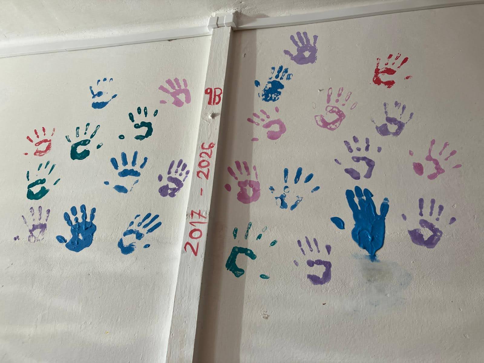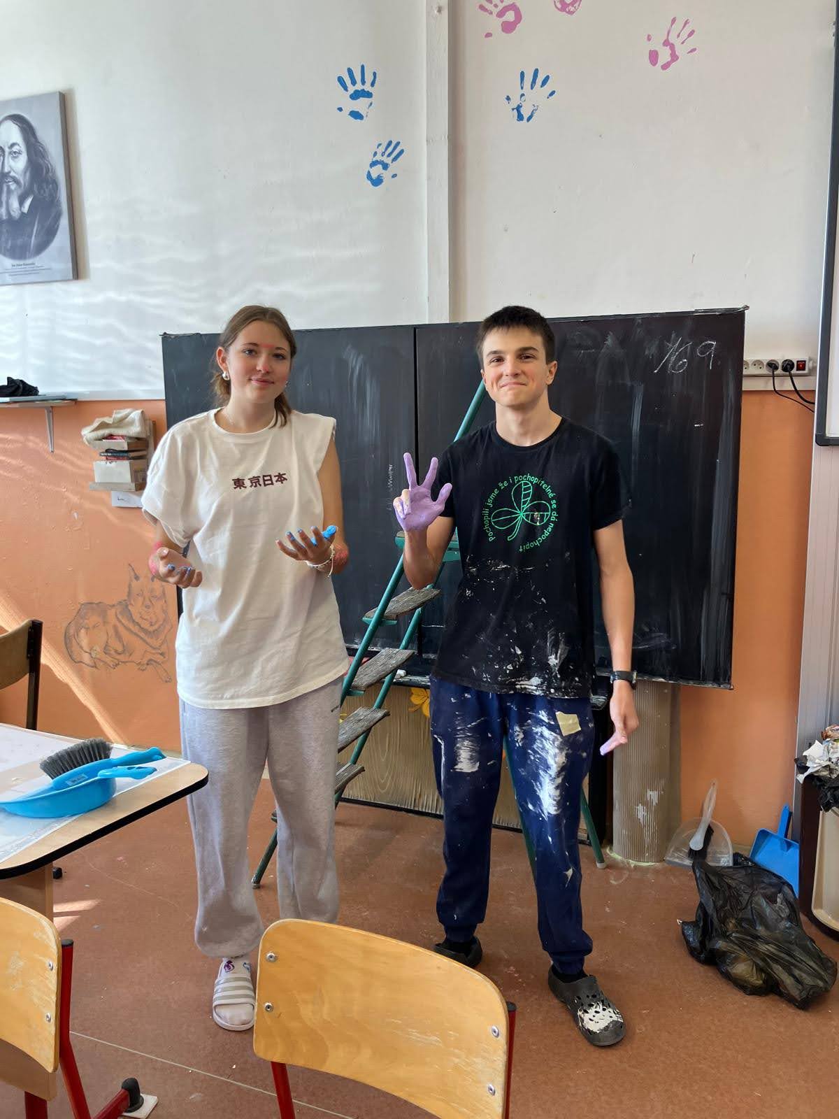 I takto mohly vypadat adaptační dny. Třída 9.B ocenila letošní novinku kmenových tříd na druhém stupni a tu SVOJI třídu si žáci rozhodli vyzdobit dle svých představ. Chopili se barev a svou představu takto dokonale ztvárnili. A že to dělají pro budoucí spolužáky jim vůbec nevadí. Ta stopa po nich zůstane! A slova samotných žáků: Adapťák po našem aneb 9.B v akci! Zhodnotili jsme situaci a došli k jasnému závěru – zkrášlit si vlastní teritorium bude ten pravý týmový zážitek. Tak jsme vzali štětce, barvy a hlavně odvahu – a proměnili naši třídu podle vlastních představ! Ano, šlo to skoro bez nehod. (Kromě pár incidentů s barvou jinde, než kde má být… :)) Nakonec jsme celou práci a naše působení na škole zpečetili dlaňovými podpisy na zdi nad tabulí. Celou operaci šéfovaly paní asistentka a paní třídní učitelka, které nás korigovaly a zachraňovaly, když jsme měli geniální nápady. A výsledek? No… podívejte se sami. Třída nám teď září jak Instagramový feed po filtrovací horečce.
