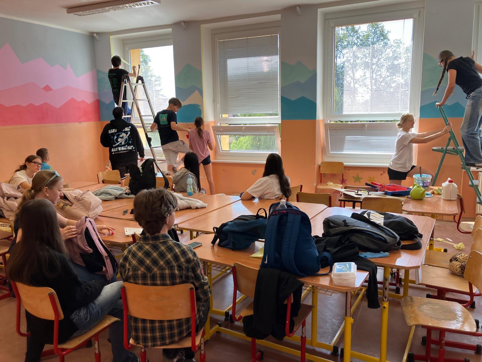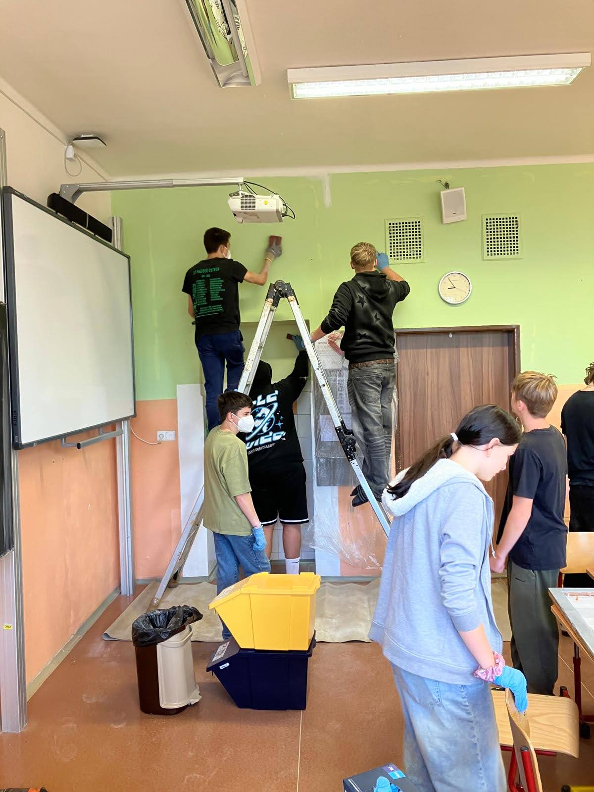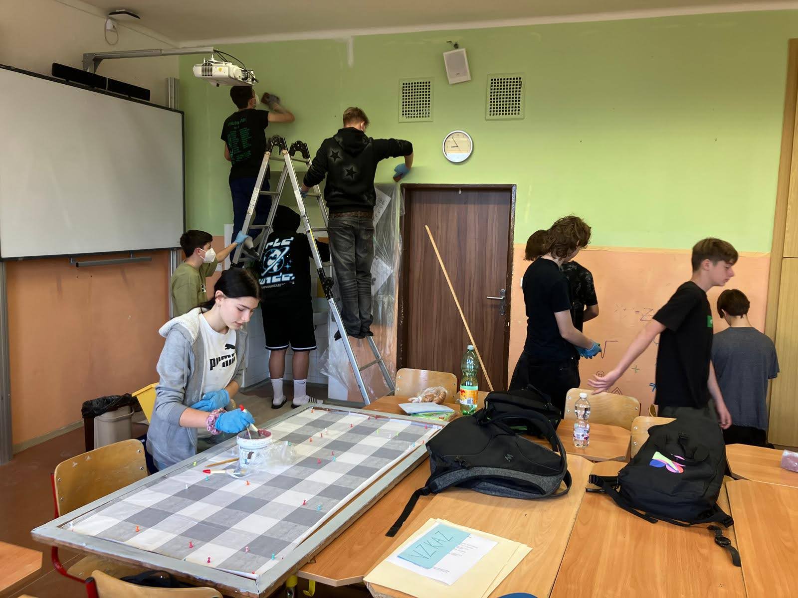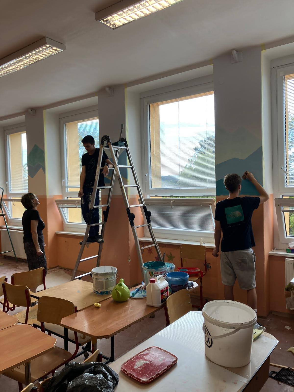 I takto mohly vypadat adaptační dny. Třída 9.B ocenila letošní novinku kmenových tříd na druhém stupni a tu SVOJI třídu si žáci rozhodli vyzdobit dle svých představ. Chopili se barev a svou představu takto dokonale ztvárnili. A že to dělají pro budoucí spolužáky jim vůbec nevadí. Ta stopa po nich zůstane! A slova samotných žáků: Adapťák po našem aneb 9.B v akci! Zhodnotili jsme situaci a došli k jasnému závěru – zkrášlit si vlastní teritorium bude ten pravý týmový zážitek. Tak jsme vzali štětce, barvy a hlavně odvahu – a proměnili naši třídu podle vlastních představ! Ano, šlo to skoro bez nehod. (Kromě pár incidentů s barvou jinde, než kde má být… :)) Nakonec jsme celou práci a naše působení na škole zpečetili dlaňovými podpisy na zdi nad tabulí. Celou operaci šéfovaly paní asistentka a paní třídní učitelka, které nás korigovaly a zachraňovaly, když jsme měli geniální nápady. A výsledek? No… podívejte se sami. Třída nám teď září jak Instagramový feed po filtrovací horečce.