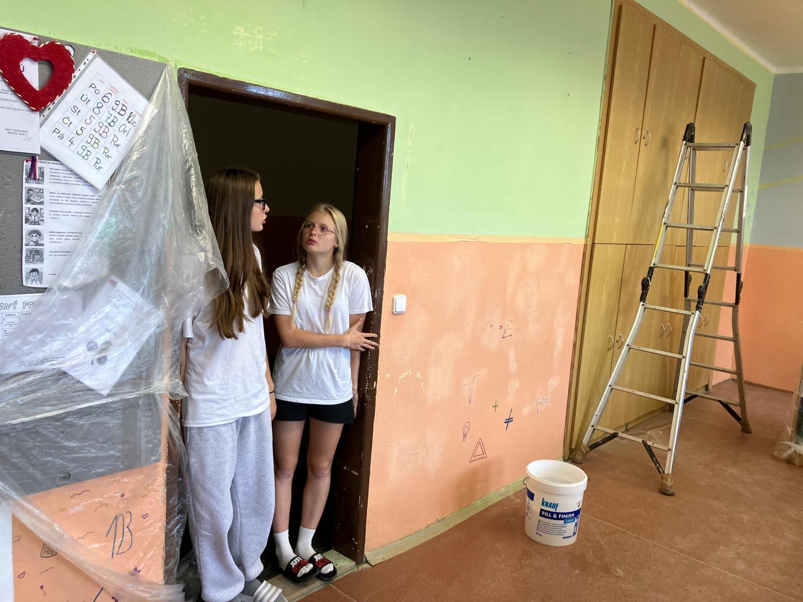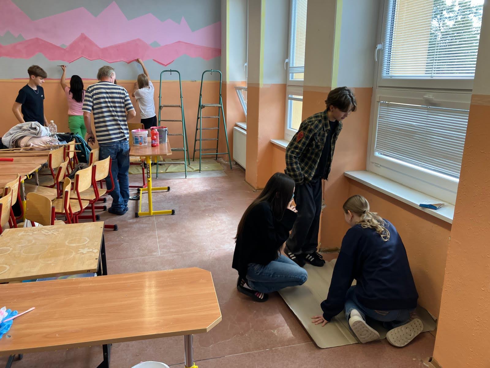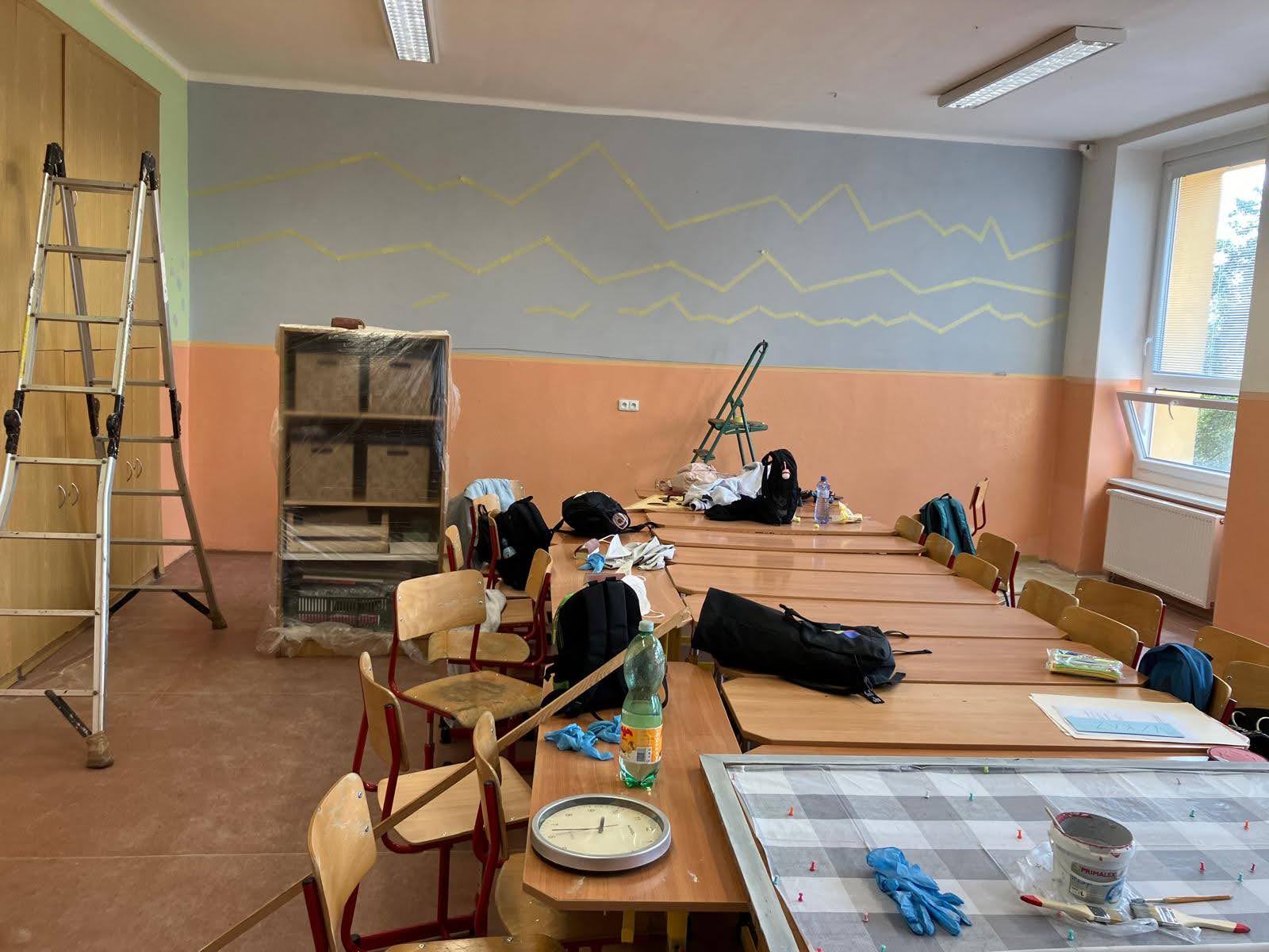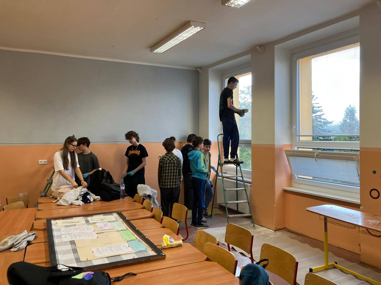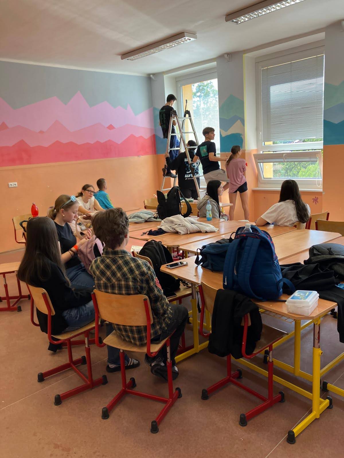 I takto mohly vypadat adaptační dny. Třída 9.B ocenila letošní novinku kmenových tříd na druhém stupni a tu SVOJI třídu si žáci rozhodli vyzdobit dle svých představ. Chopili se barev a svou představu takto dokonale ztvárnili. A že to dělají pro budoucí spolužáky jim vůbec nevadí. Ta stopa po nich zůstane! A slova samotných žáků: Adapťák po našem aneb 9.B v akci! Zhodnotili jsme situaci a došli k jasnému závěru – zkrášlit si vlastní teritorium bude ten pravý týmový zážitek. Tak jsme vzali štětce, barvy a hlavně odvahu – a proměnili naši třídu podle vlastních představ! Ano, šlo to skoro bez nehod. (Kromě pár incidentů s barvou jinde, než kde má být… :)) Nakonec jsme celou práci a naše působení na škole zpečetili dlaňovými podpisy na zdi nad tabulí. Celou operaci šéfovaly paní asistentka a paní třídní učitelka, které nás korigovaly a zachraňovaly, když jsme měli geniální nápady. A výsledek? No… podívejte se sami. Třída nám teď září jak Instagramový feed po filtrovací horečce.