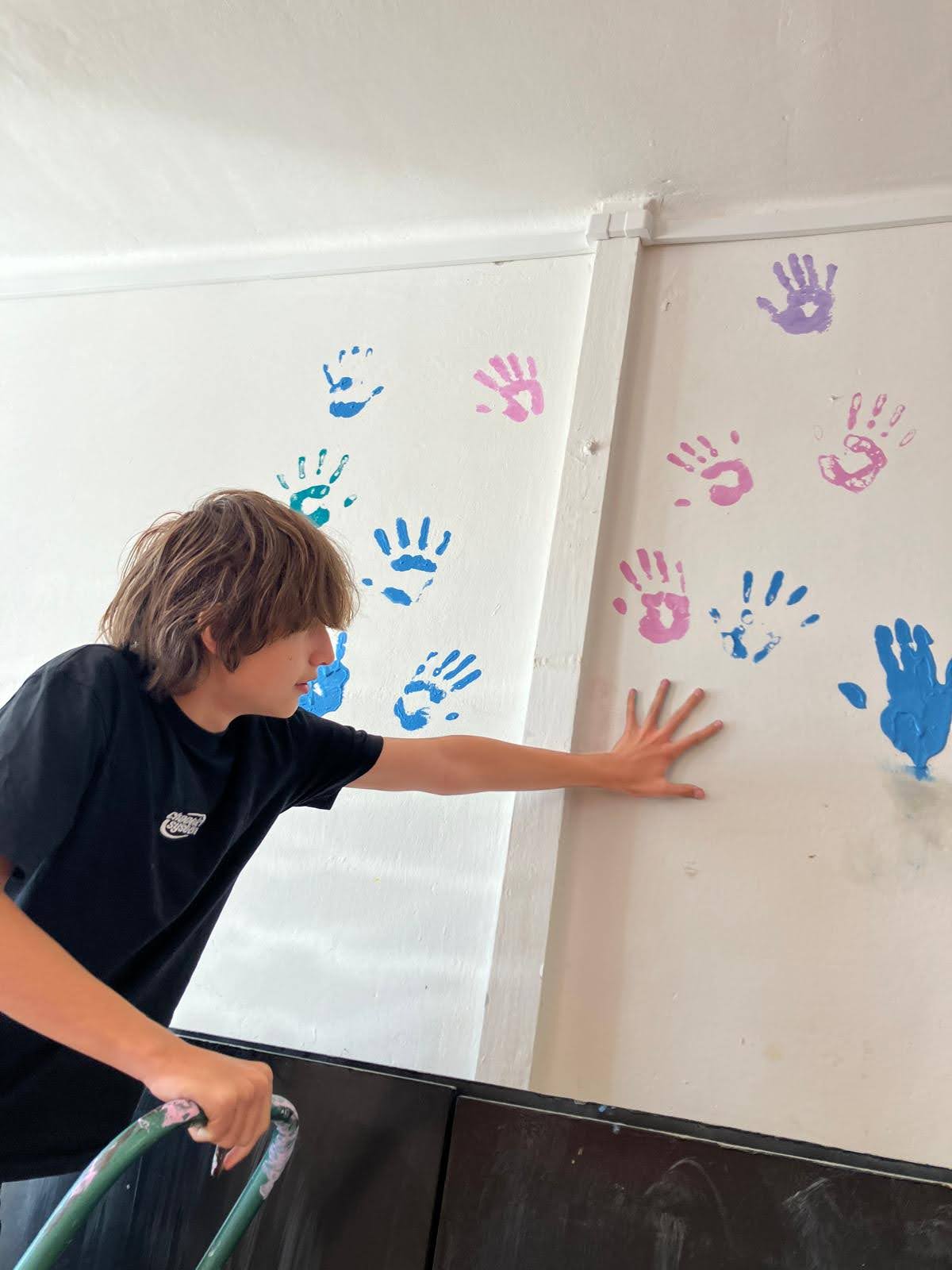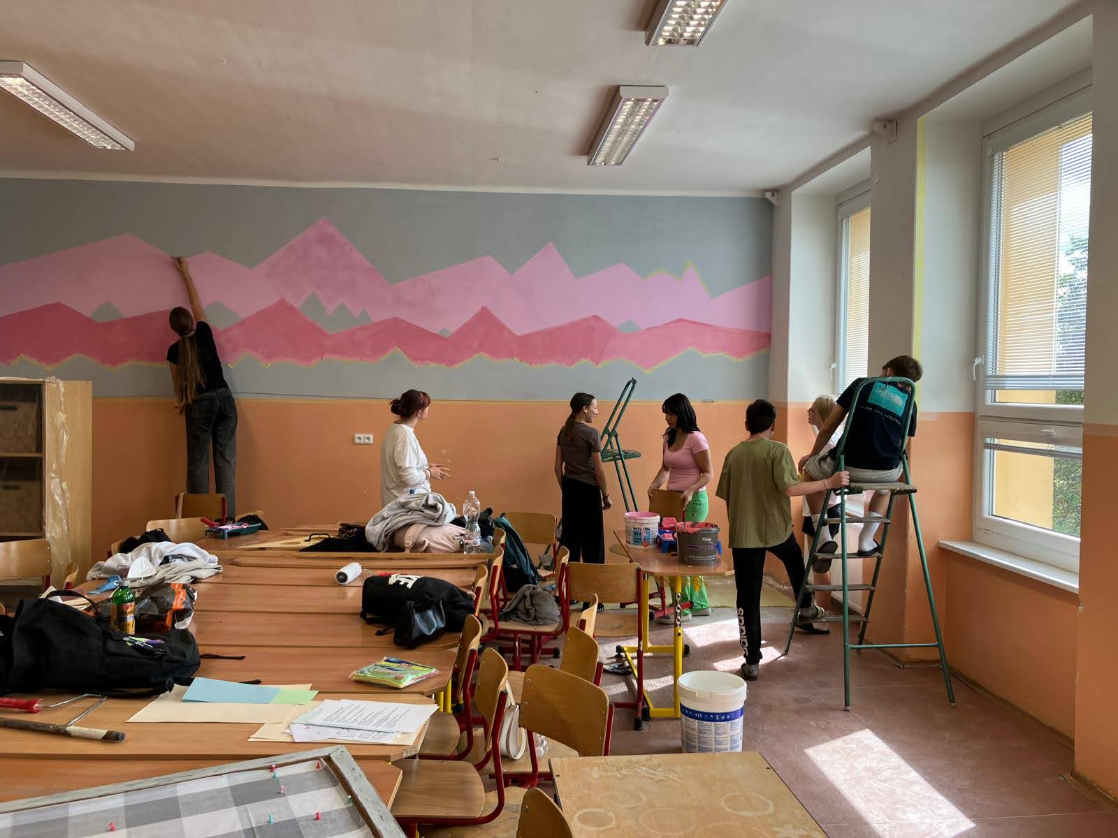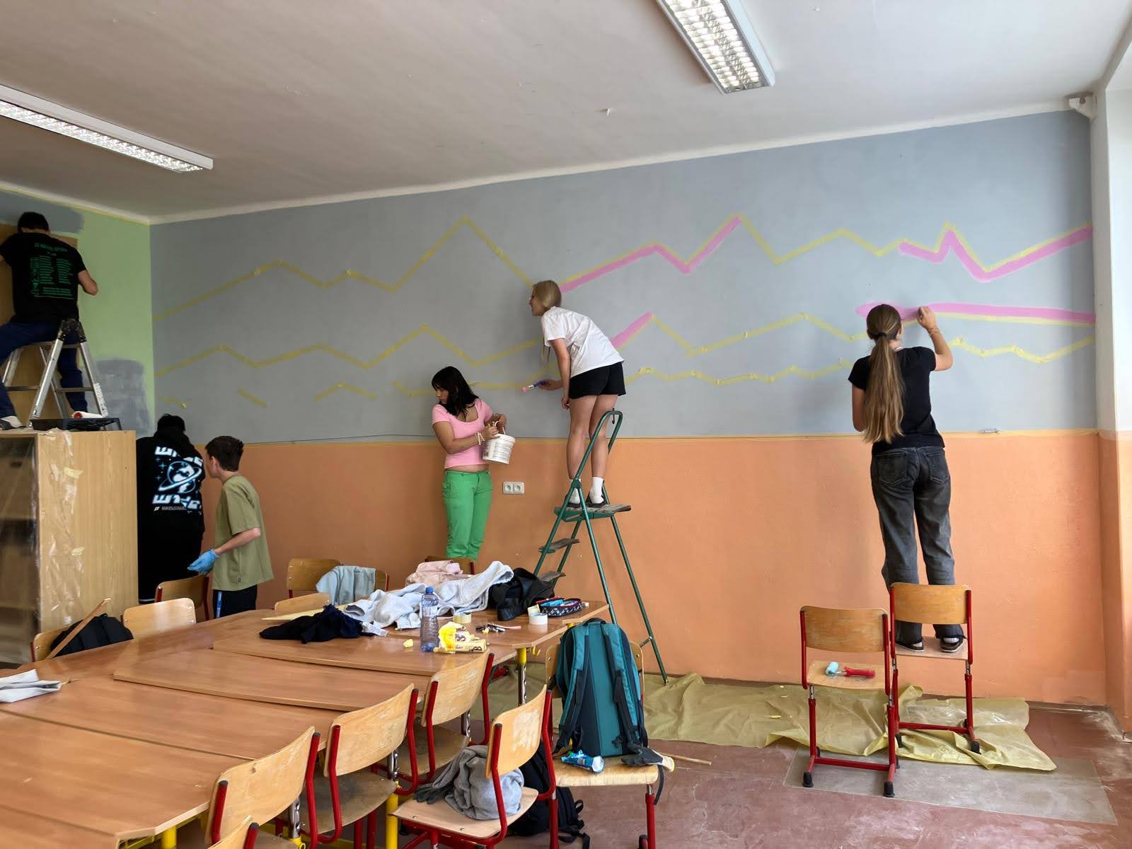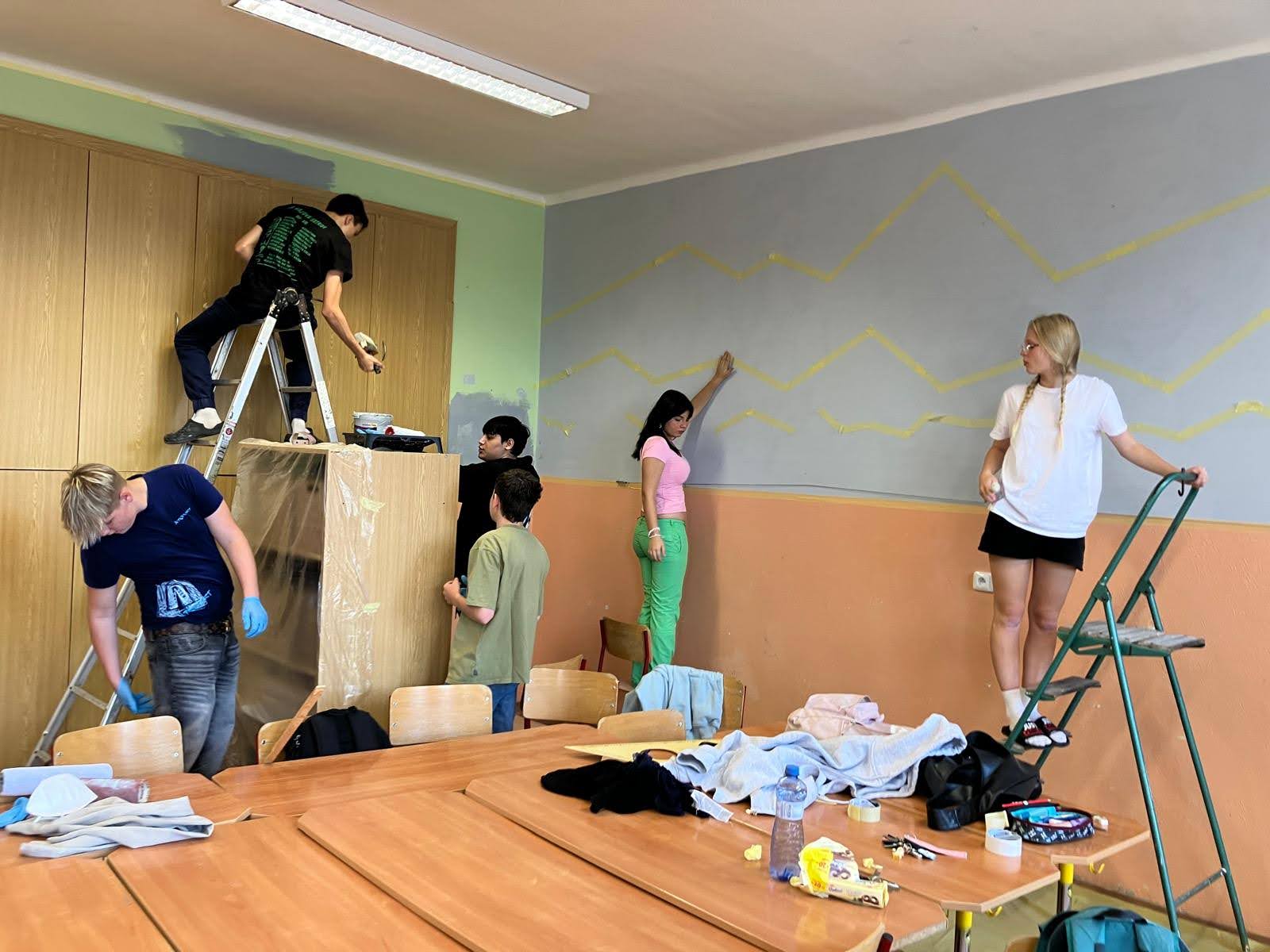 I takto mohly vypadat adaptační dny. Třída 9.B ocenila letošní novinku kmenových tříd na druhém stupni a tu SVOJI třídu si žáci rozhodli vyzdobit dle svých představ. Chopili se barev a svou představu takto dokonale ztvárnili. A že to dělají pro budoucí spolužáky jim vůbec nevadí. Ta stopa po nich zůstane! A slova samotných žáků: Adapťák po našem aneb 9.B v akci! Zhodnotili jsme situaci a došli k jasnému závěru – zkrášlit si vlastní teritorium bude ten pravý týmový zážitek. Tak jsme vzali štětce, barvy a hlavně odvahu – a proměnili naši třídu podle vlastních představ! Ano, šlo to skoro bez nehod. (Kromě pár incidentů s barvou jinde, než kde má být… :)) Nakonec jsme celou práci a naše působení na škole zpečetili dlaňovými podpisy na zdi nad tabulí. Celou operaci šéfovaly paní asistentka a paní třídní učitelka, které nás korigovaly a zachraňovaly, když jsme měli geniální nápady. A výsledek? No… podívejte se sami. Třída nám teď září jak Instagramový feed po filtrovací horečce.