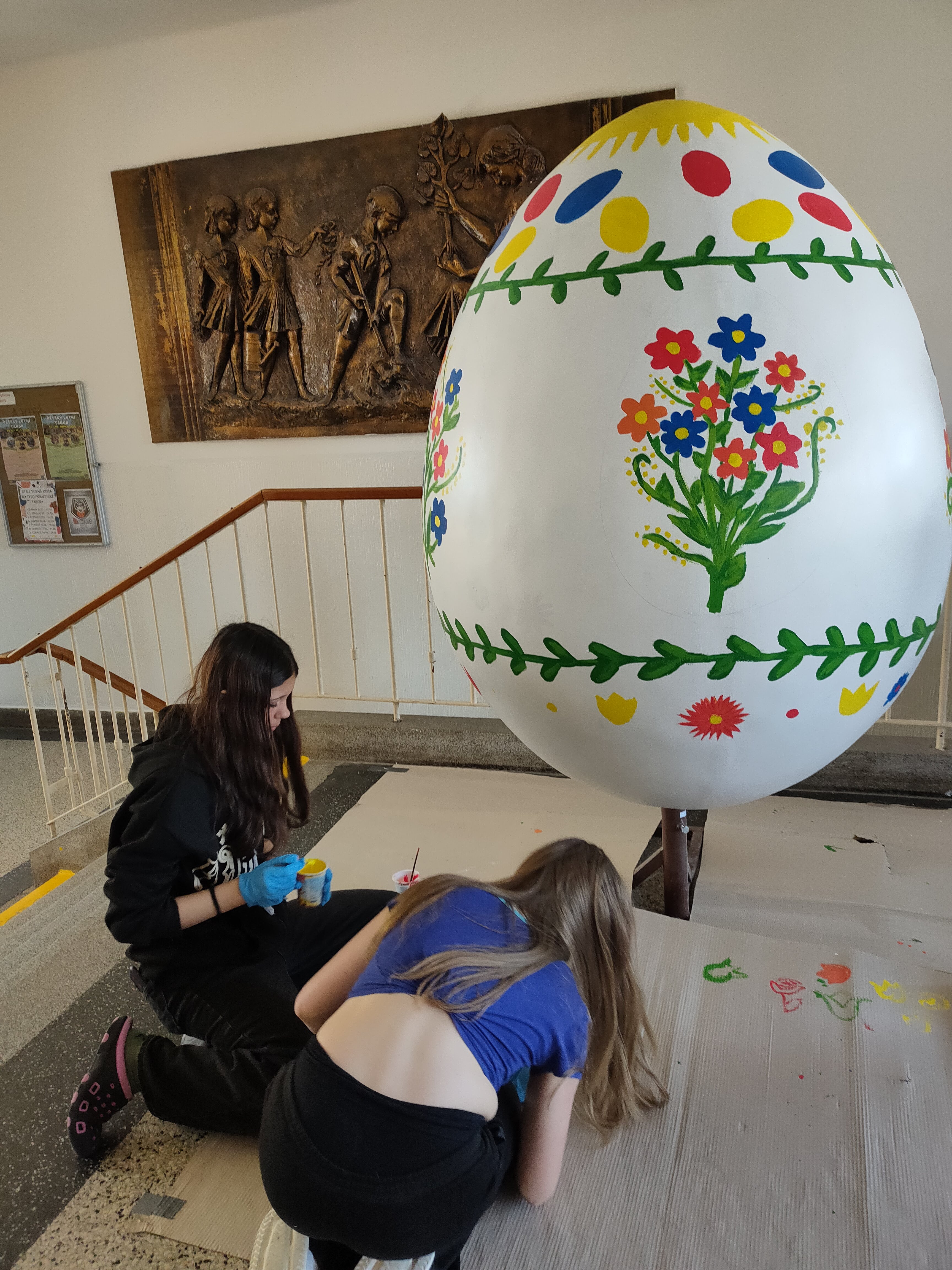 Při velikonočních slavnostech v sobotu 4. dubna jsme mohli na Starém náměstí obdivovat i obří vajíčka. V letošním roce přibyla k velkým vejcím základních škol i další menší, o jejichž výmalbu se postaraly mateřské školy. To naše vznikalo pod vedením paní učitelky Purkytové a na zdobení se podíleli žáci osmých tříd při volitelném předmětu Užité výtvarné umění. Nyní již můžeme odtajnit fotografie z průběhu jeho zdobení i jeho finální podobu. Originál bude k vidění na Starém náměstí ještě několik dní. Přijďte se podívat.